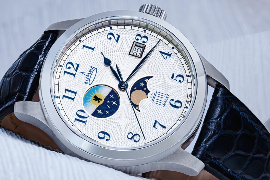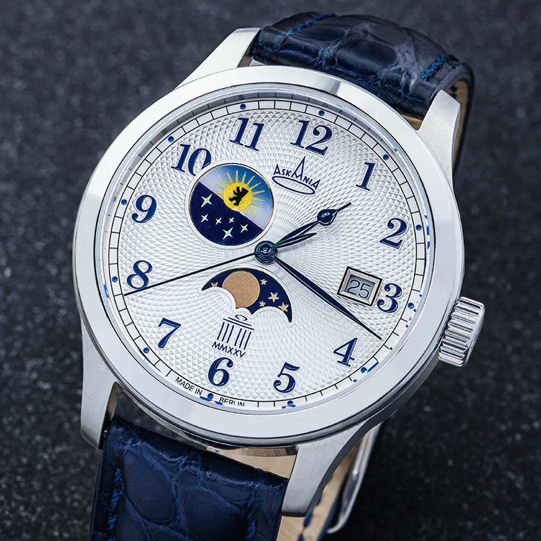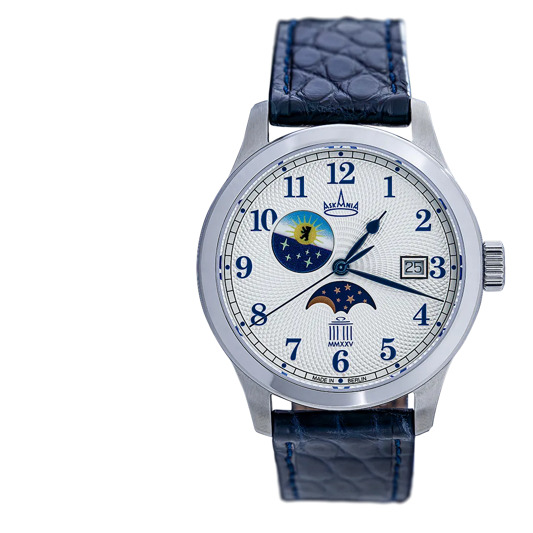 Das guillochierte Zifferblatt in Silbermond Metallic entfaltet je nach Lichteinfall ein faszinierendes Spiel aus Tiefe und Struktur. Die feine Musterung wirkt wie ein Geflecht aus Sonnenstrahlen über der Hauptstadt. Doch in diesem Jahr wollten wir mehr zeigen als nur den Lauf der Stunden – wir wollten den Rhythmus des Lebens sichtbar machen.
